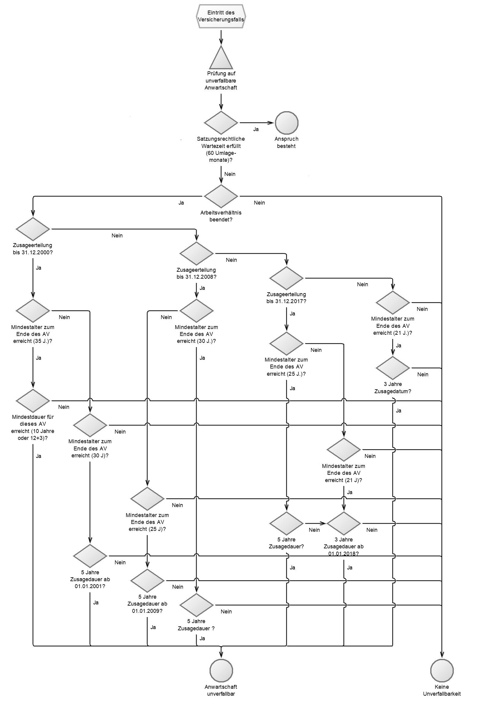 Anhand des Prüfschemas erfahren Sie, ob eine Versicherte oder ein Versicherter eine satzungsrechtliche oder eine nach dem BetrAVG unverfallbare Anwartschaft auf eine kvw-Betriebsrente hat. Frühere gesetzliche, tarifvertragliche und satzungsmäßige Regelungen sind hier nicht berücksichtigt.